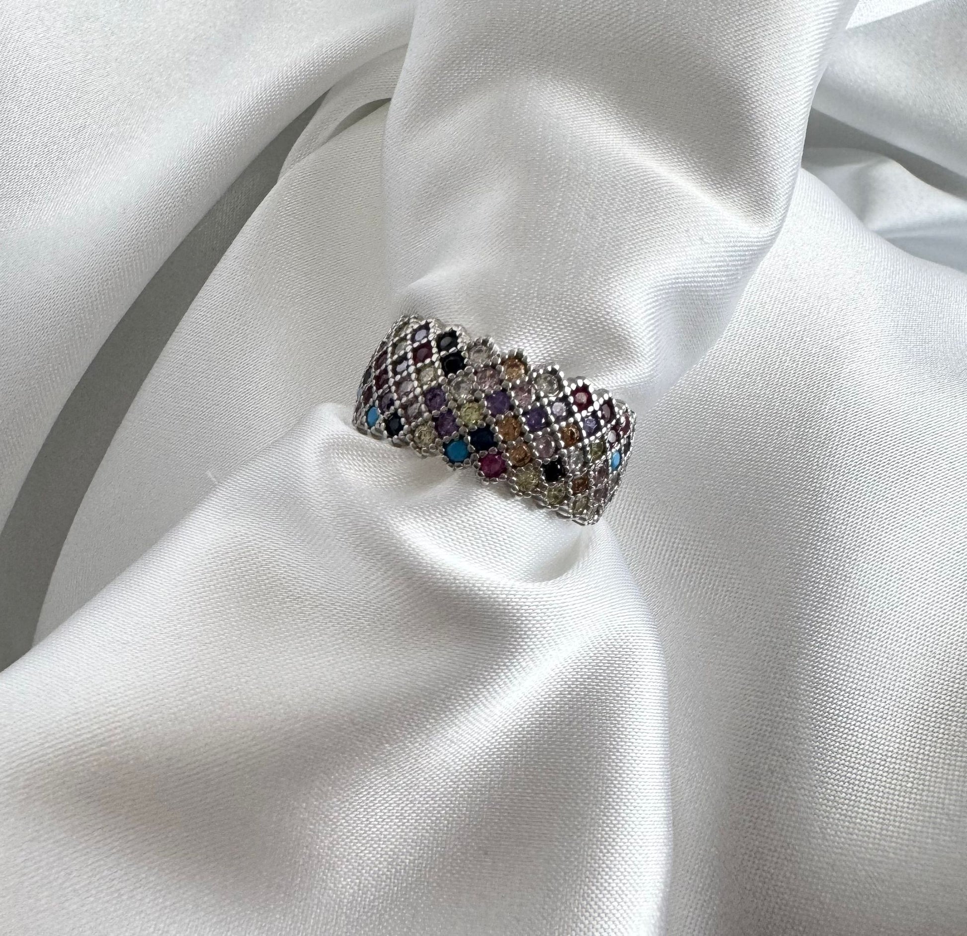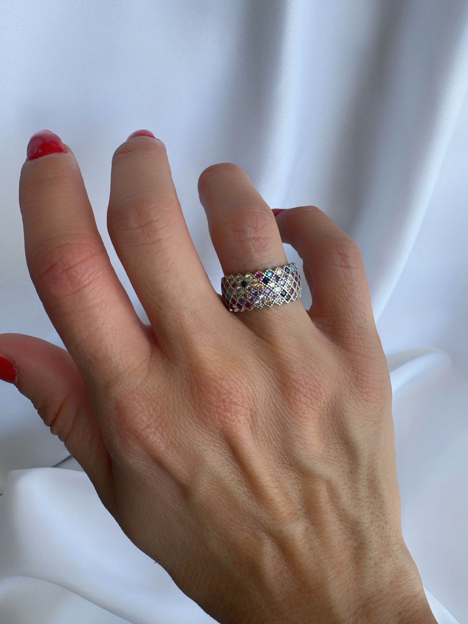 טבעת קשת רחבה- טבעת בשילוב זרקונים צבעוניים מכסף 925