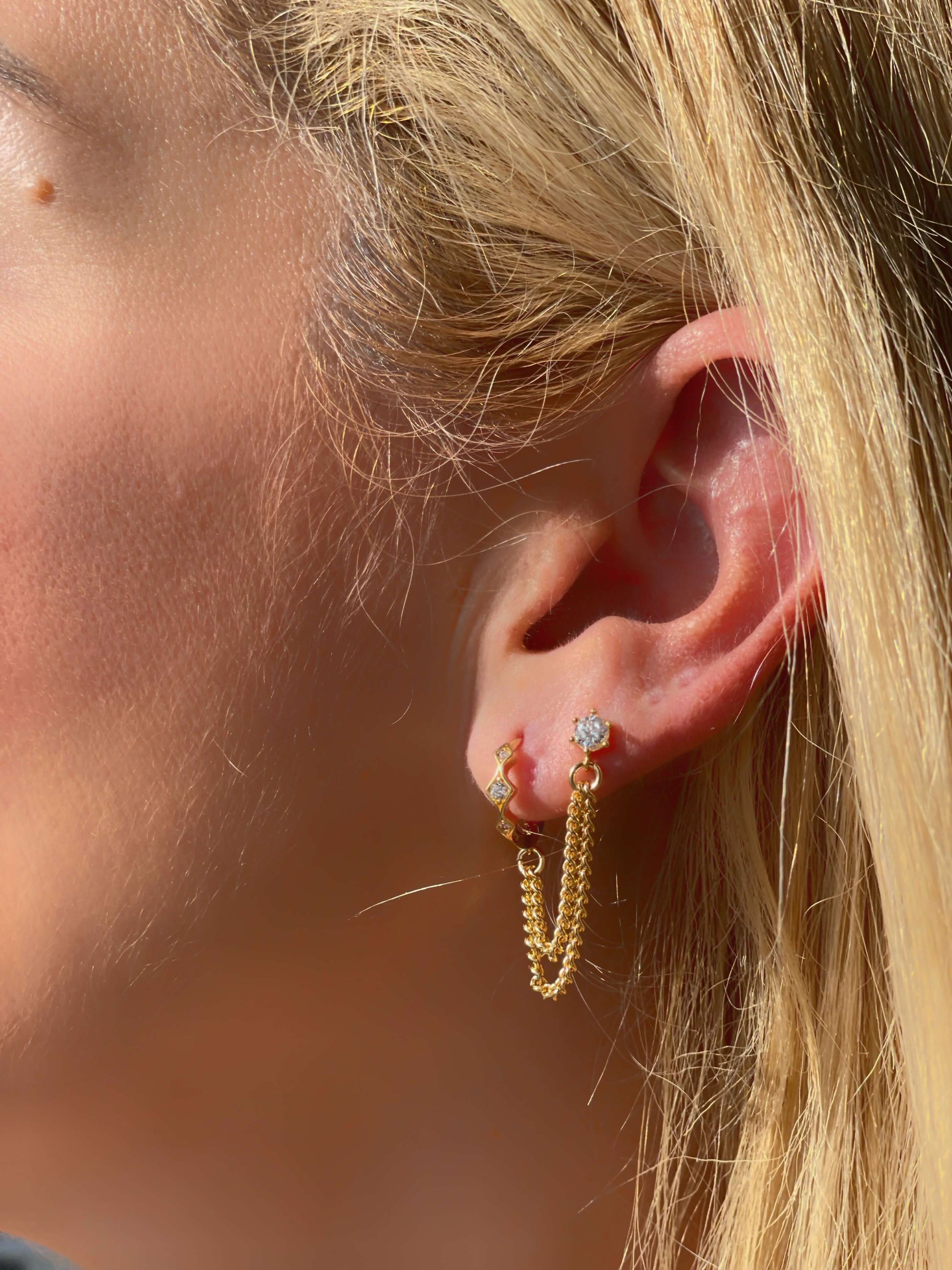 עגיל דנה- עגיל חישוק  משובץ זירקונים  בשילוב שרשראות  ועגיל נצמד בשילוב זירקון.