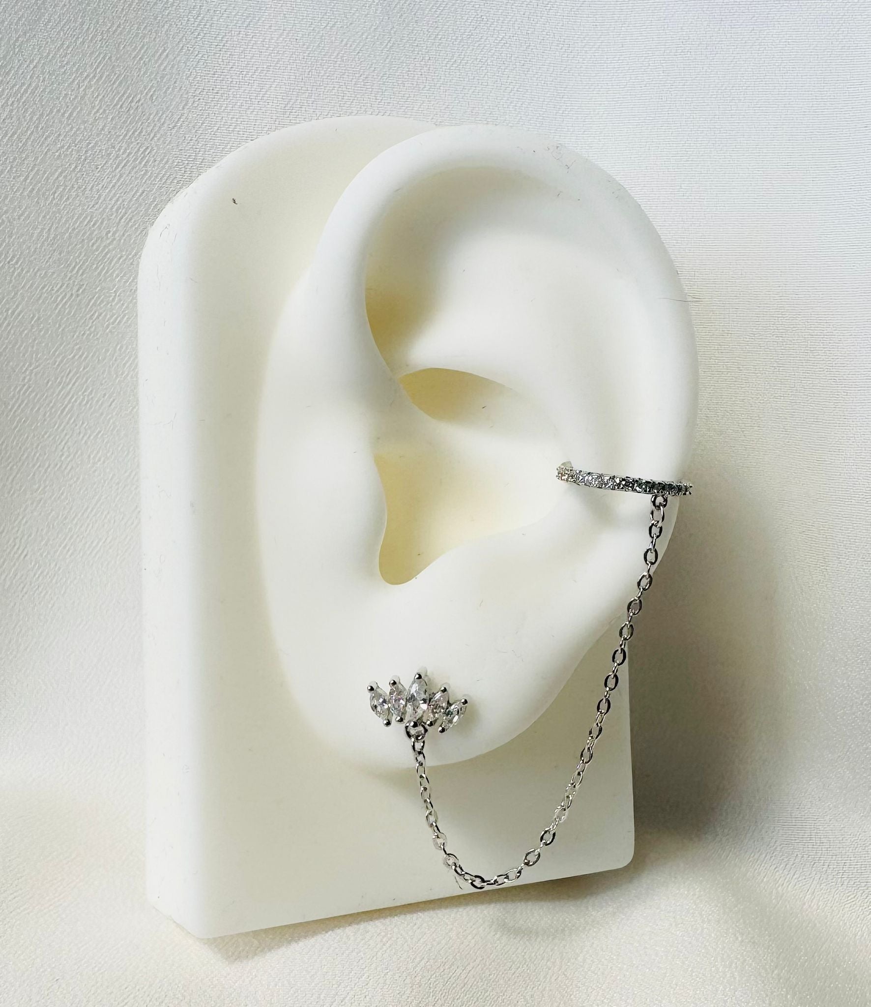 עגיל פרי לוטוס - עגיל משובץ זירקונים מכסף 925 בשילוב שרשרת כסף ועגיל דמוי אליקס בשילוב זירקון שקוף.