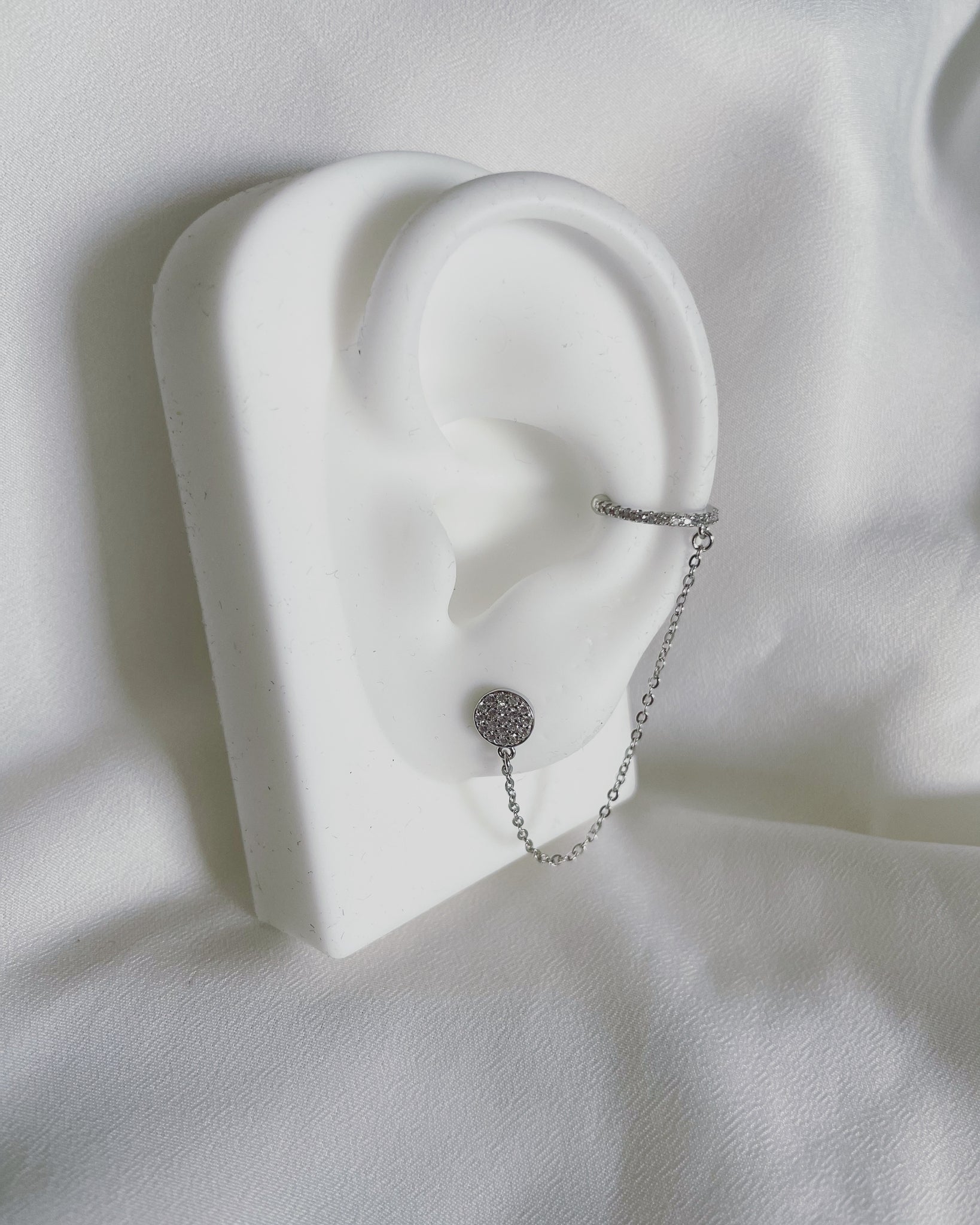 עגיל פרי עיגול - עגיל משובץ זירקונים מכסף 925 בשילוב שרשרת כסף ועגיל דמוי אליקס בשילוב זירקון שקוף.