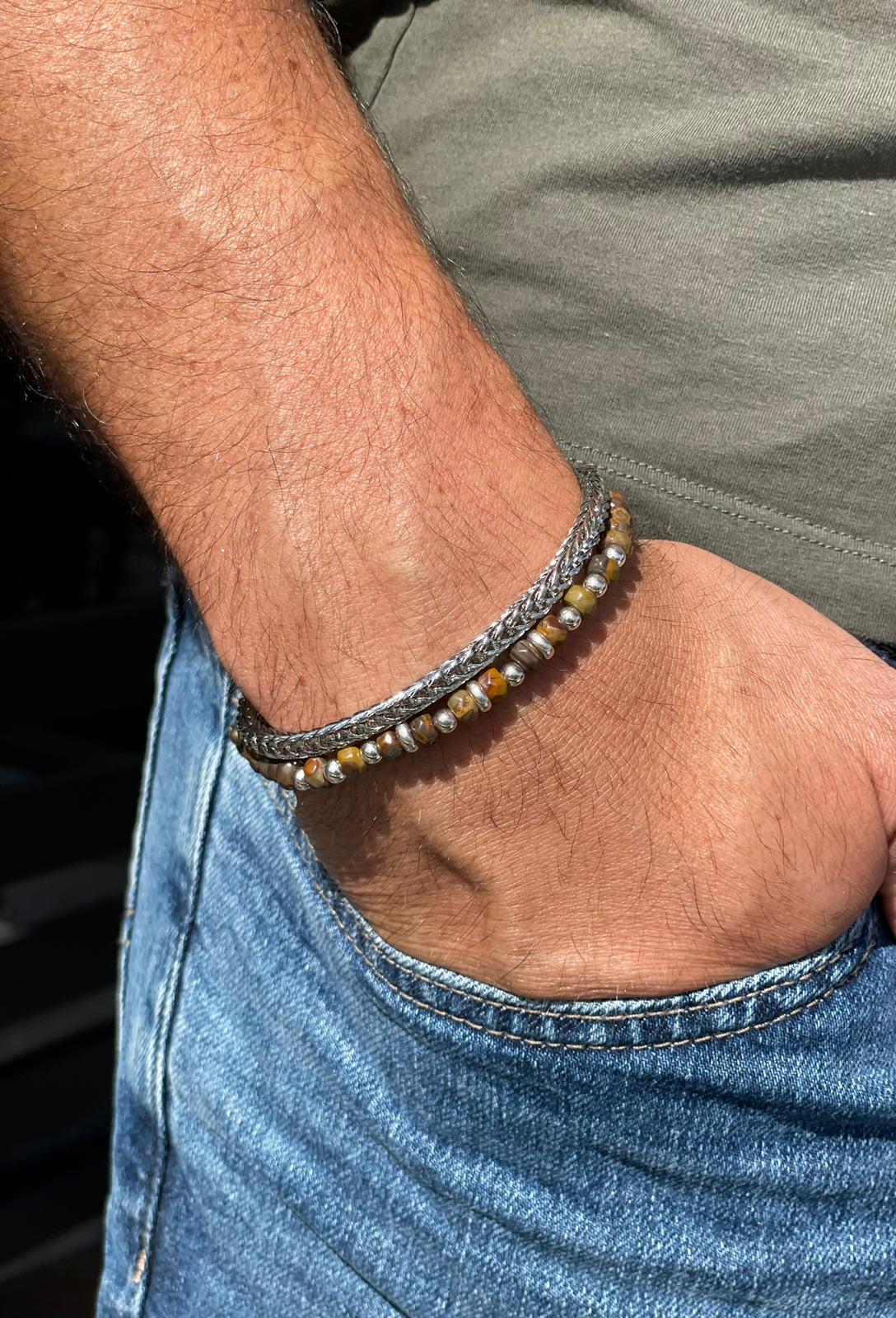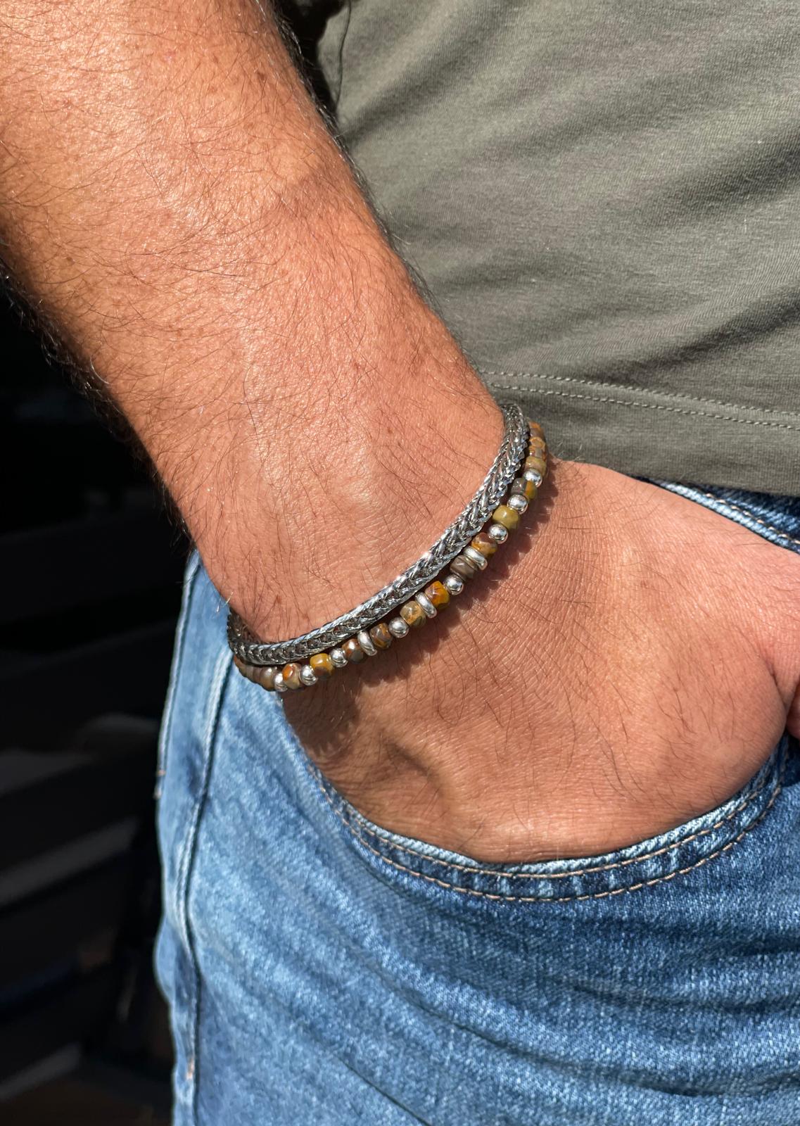 שילוב בארי - צמיד אבנים בראון בגודל 4 מ"מ בגוון חום בשילוב צמיד חץ.