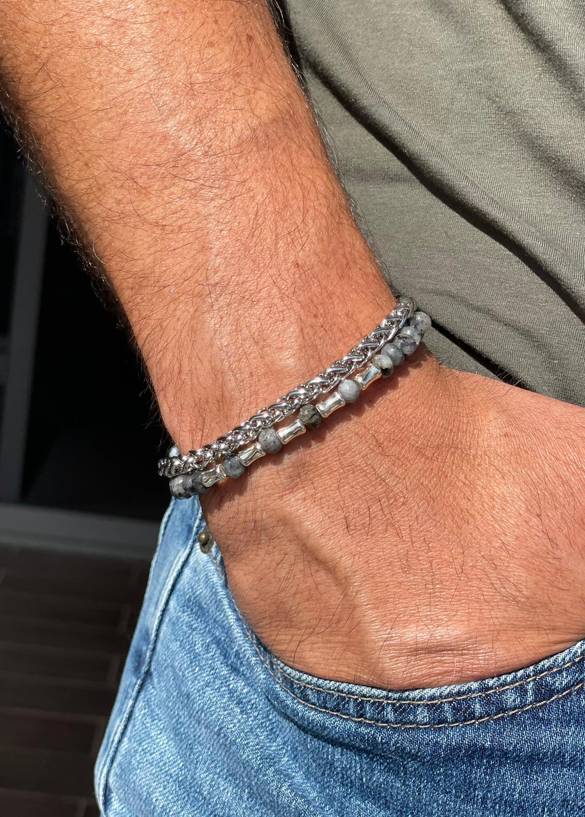 שילוב נתן - צמיד אבנים green בגודל 6 מ"מ בגוון אפור בשילוב חבל.