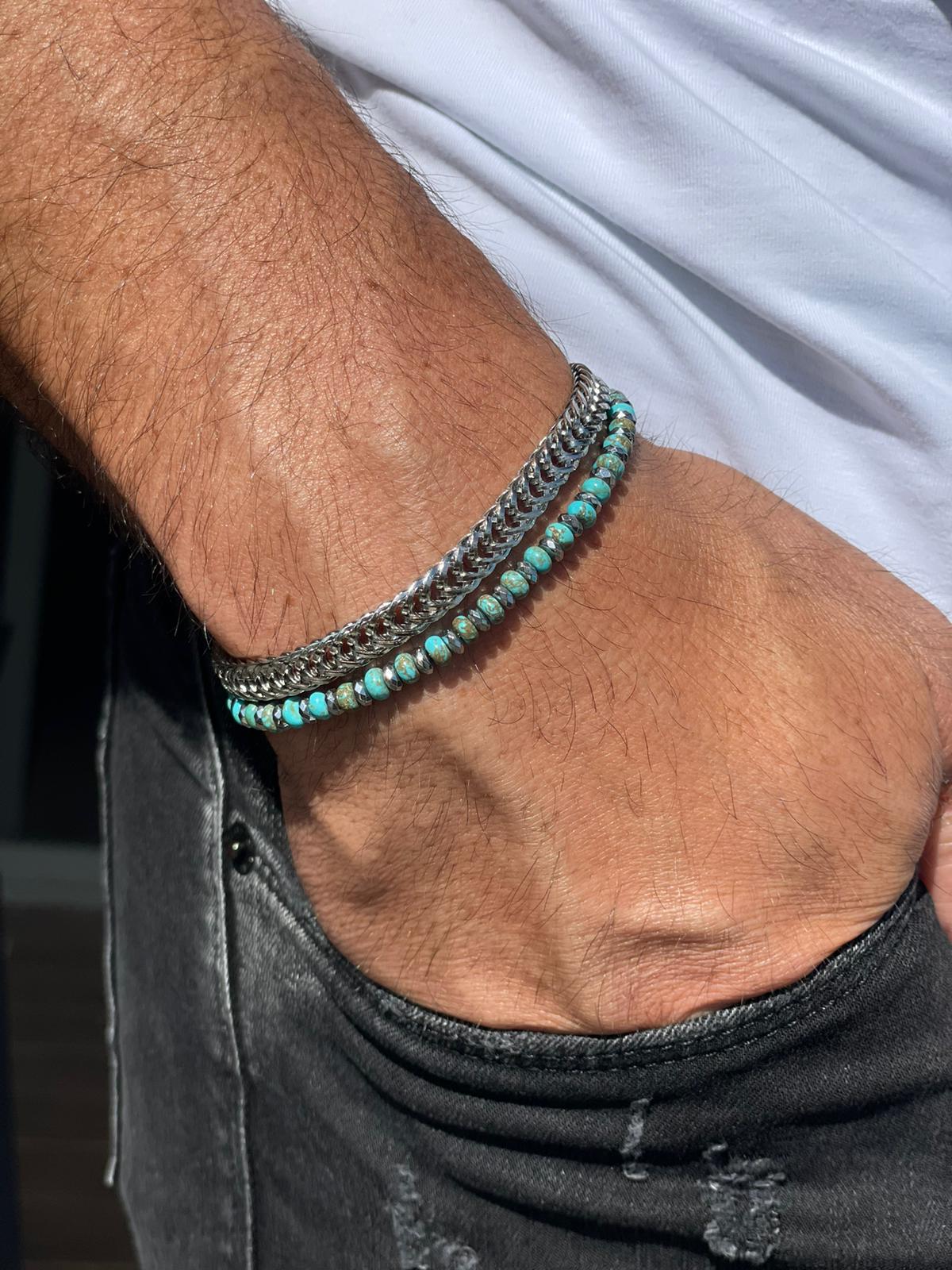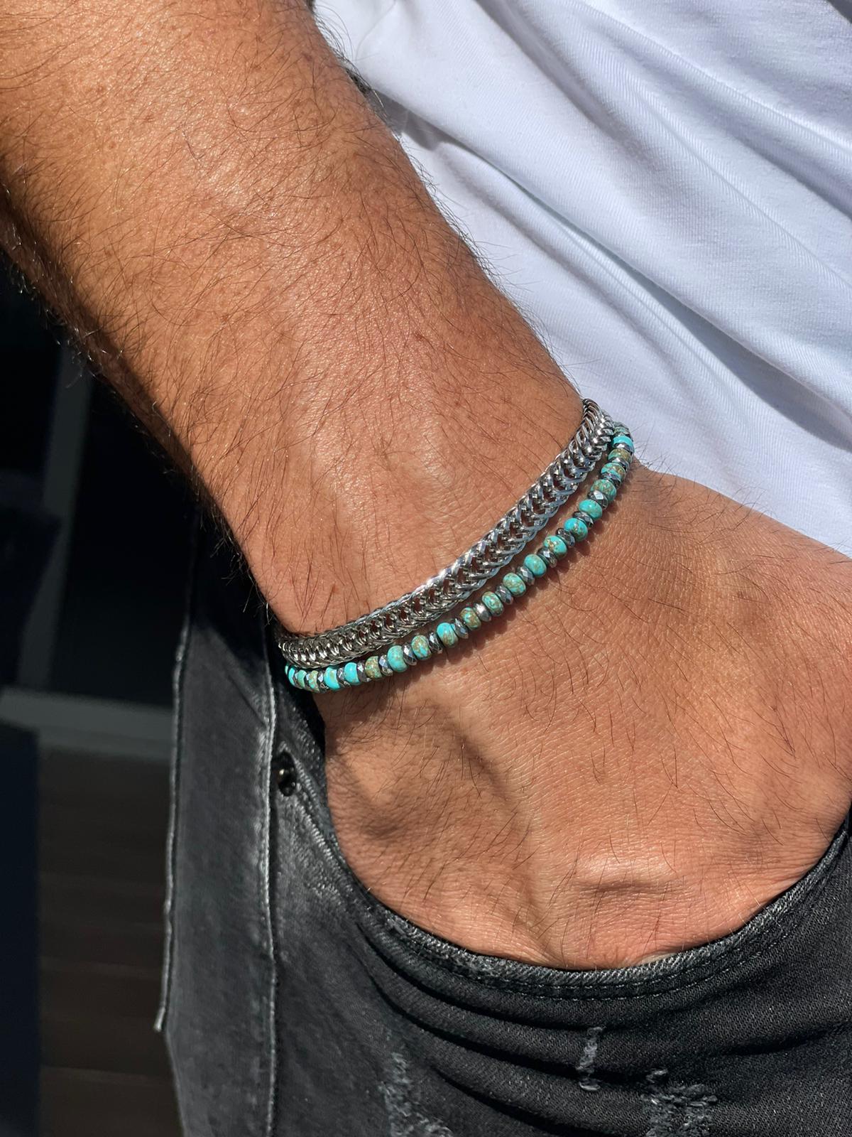 שילוב עמדי - צמיד טורקיז ,אבנים בגודל 4 מ"מ בגוון טורקיז בשילוב צמיד צמות.
