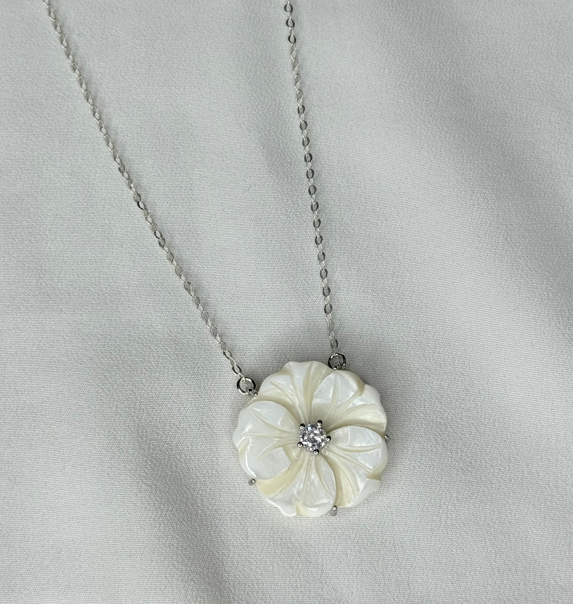 שרשרת פרח צדף משובץ -שרשרת כסף 925 בשילוב תליון פרח וזירקון